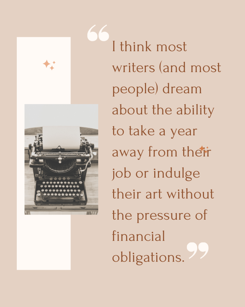There’s a well-known story about the origins of To Kill A Mockingbird by Harper Lee that is something of a writer’s fantasy. Lee was working customer service jobs in New York and publishing short stories on the side in 1956. She managed to get a literary agent (no small feat!) and one month later, her friends gifted her enough money to cover her expenses for a year with a note: “You have one year off from your job to write whatever you please. Merry Christmas.”