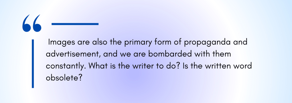 And we are quite far along into this way of life, are we not? Our relationship to images accelerated dramatically in the last fifty or so years, and that overload itself kicked further into high gear in the 21st century with the smartphone and social media. If you see a beautiful sunset, you can take a photograph or even a panorama of it with your smartphone. All sorts of fantastical fauna, spaceships, and floating castles can be represented with computer-generated imagery, with near-complete photorealism. Images are also the primary form of propaganda and advertisement, and we are bombarded with them constantly. What is the writer to do? Is the written word obsolete?