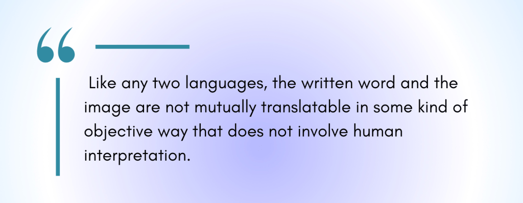 Let me propose another, more contemporary solution. If there is an image or a set of images that you really do want to share with your readers, do it! You can create it yourself or with the collaboration of a visual artist of some kind. Maybe your novel wants to be a graphic novel. Maybe you want to include a map of a kingdom, a computer model of a spaceship, or something more avant-garde, a photograph or painting that represents a specific emotion, affect, or vision that you believe writing cannot or should not or need not represent. We do so much reading and media consumption with our devices and they can come in handy here because they make it fairly easy to put together and display multimedia. Another benefit of this approach is that it is pro-social and it involves your artistic community. Collaboration may also help you further articulate and develop your vision, and if you are able, you should compensate your collaborators. Of course, sometimes what we need is not other collaborators but to isolate ourselves to do our work, which is also fine.